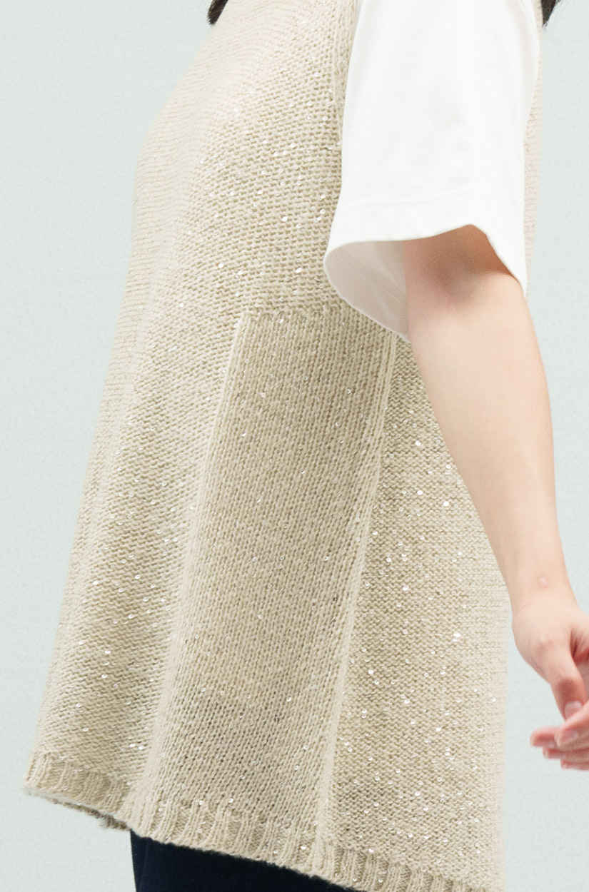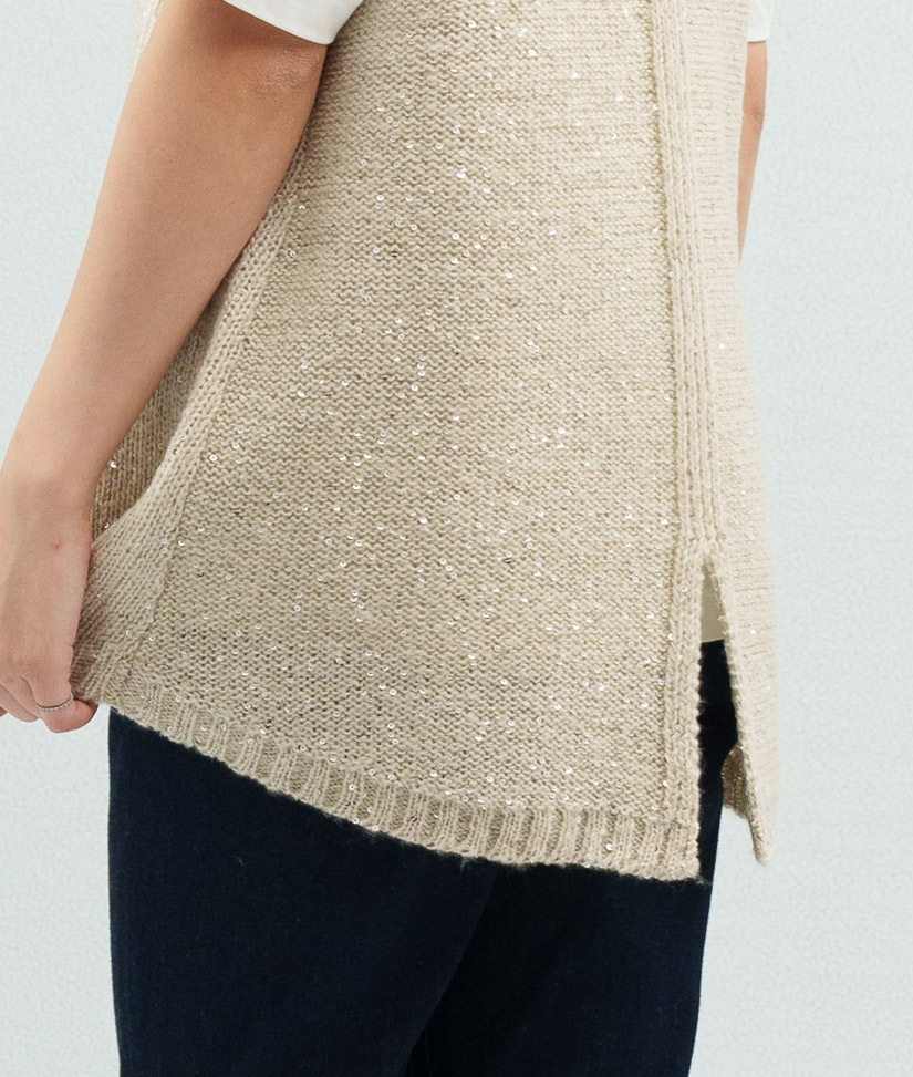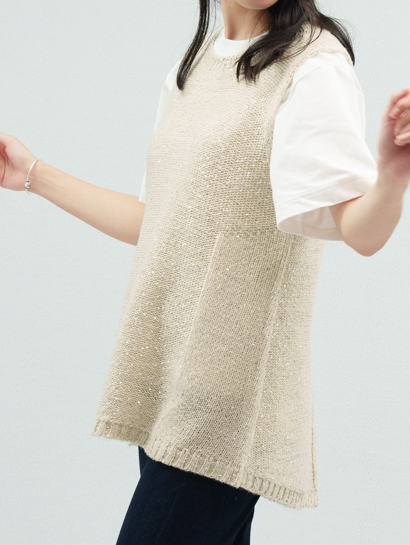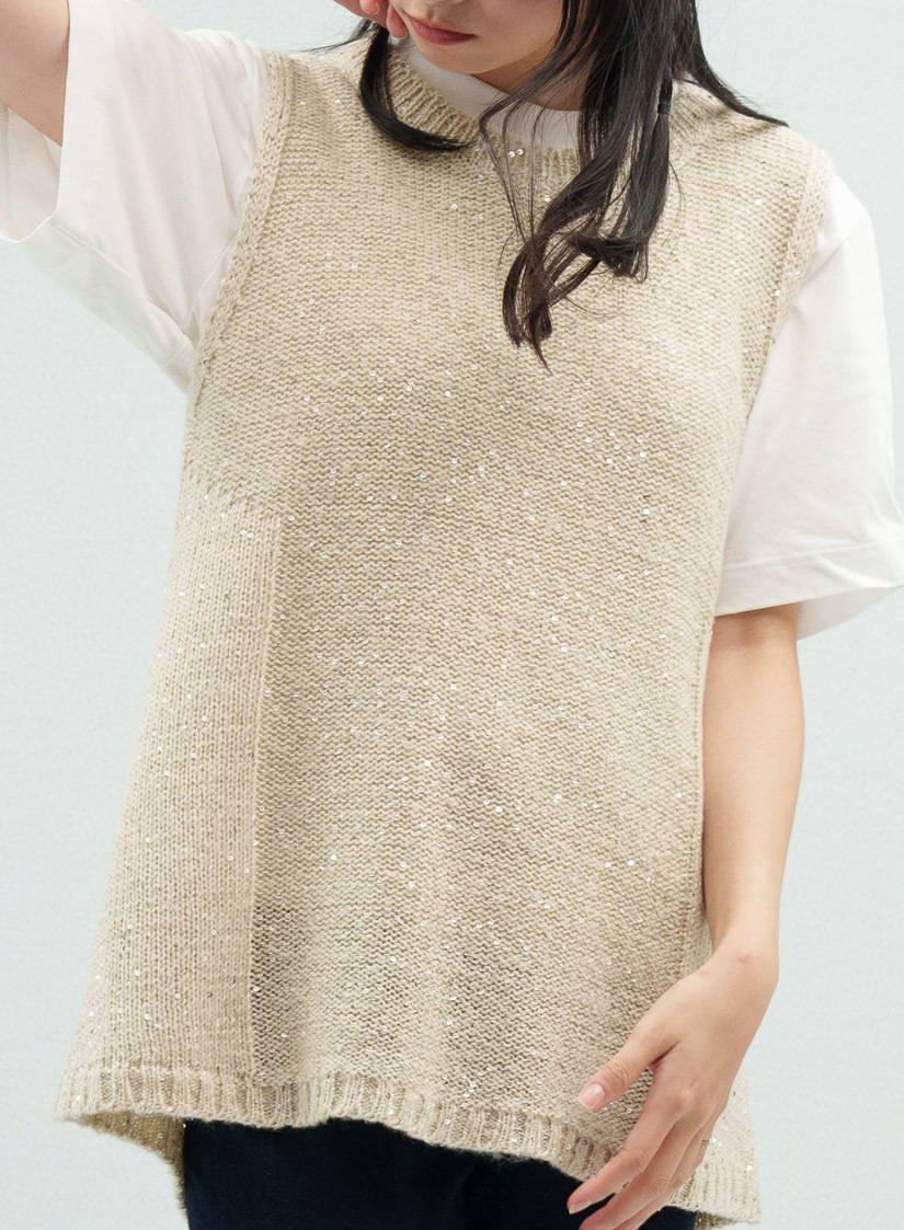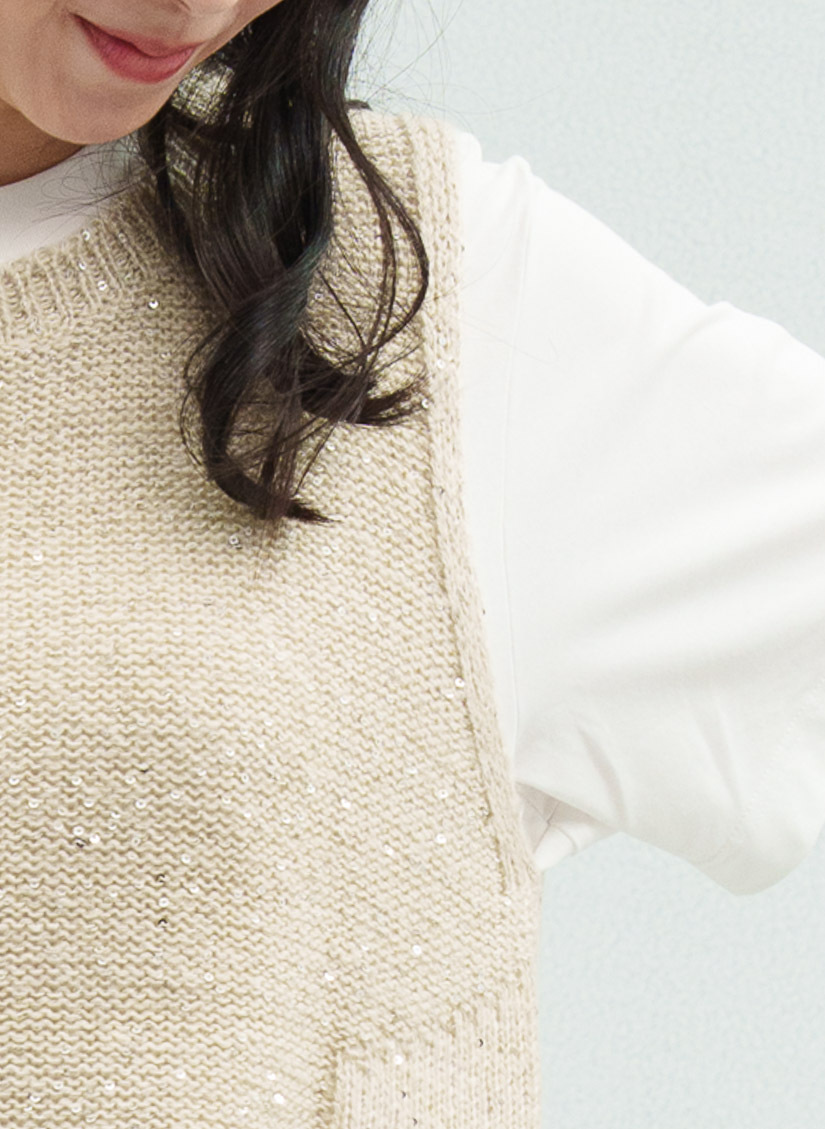 • 針織背心選用同色系亮片紗與觸感輕柔的毛海紗混合編織,散發低調的光澤感~展現質感穿搭。