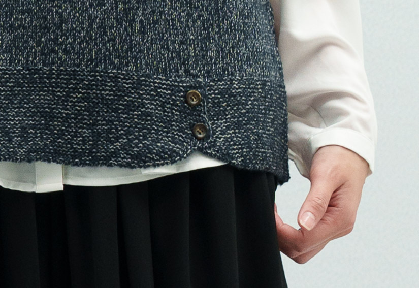 • 衣襬細橫紋翻針設計,縫上兩顆牛角紋釦,衣襬呈現自然圓弧~穿起來更俏麗。
