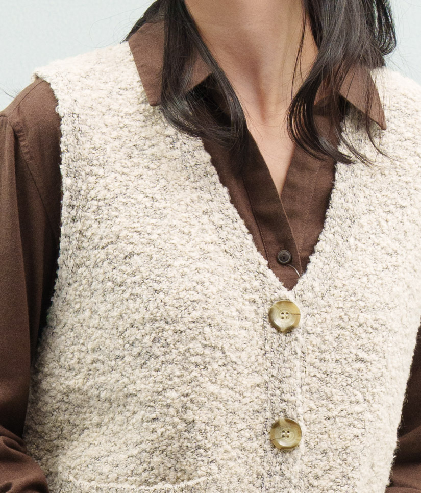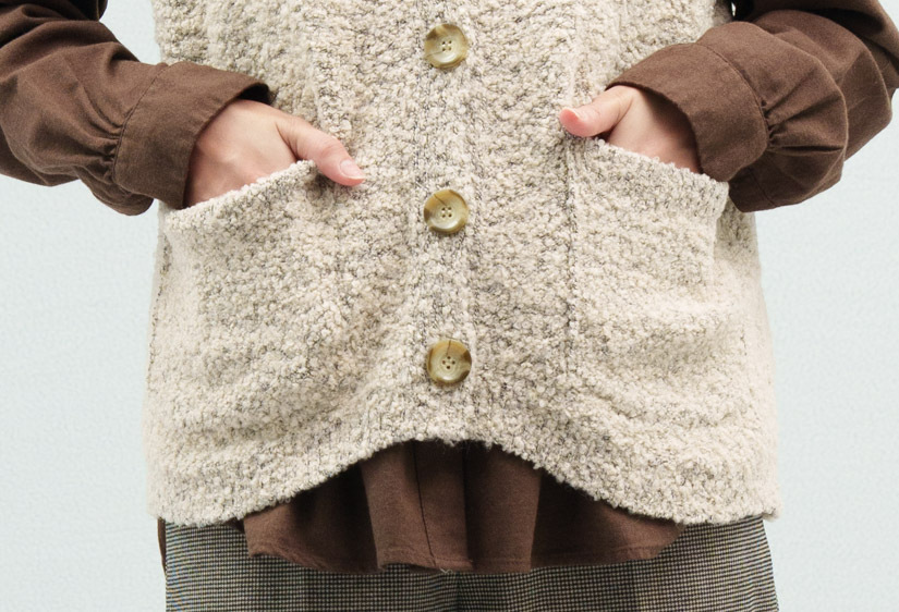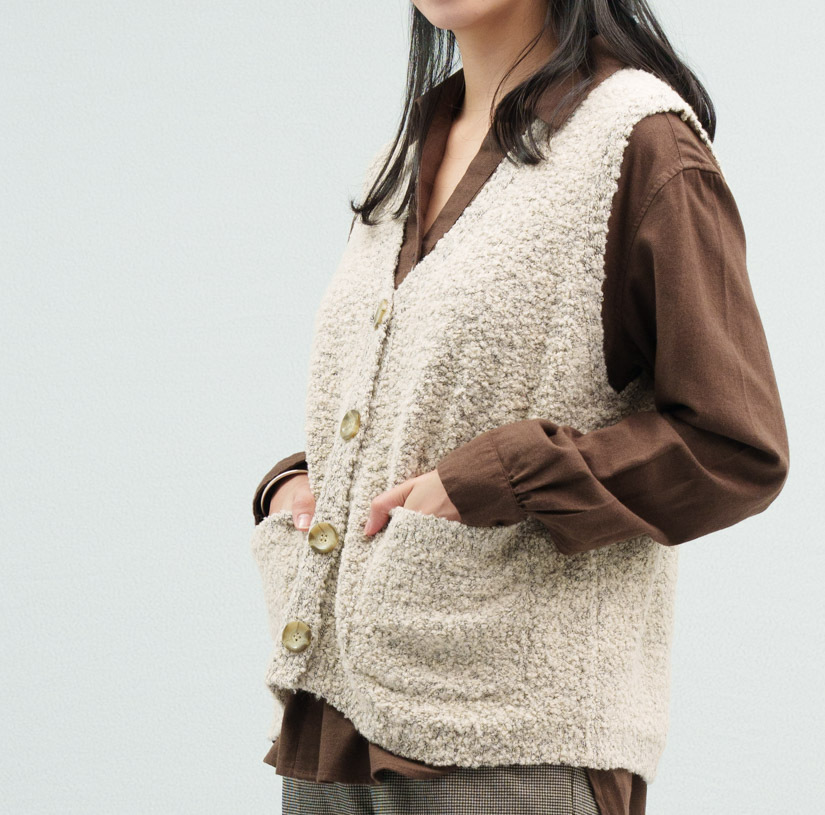 • 針織背心單層編織,看似有點厚度其實不然,Q彈觸感穿起來輕盈而不厚重,很適合台灣秋~冬~春~跨季節穿搭。