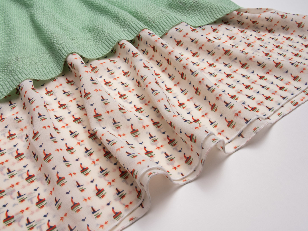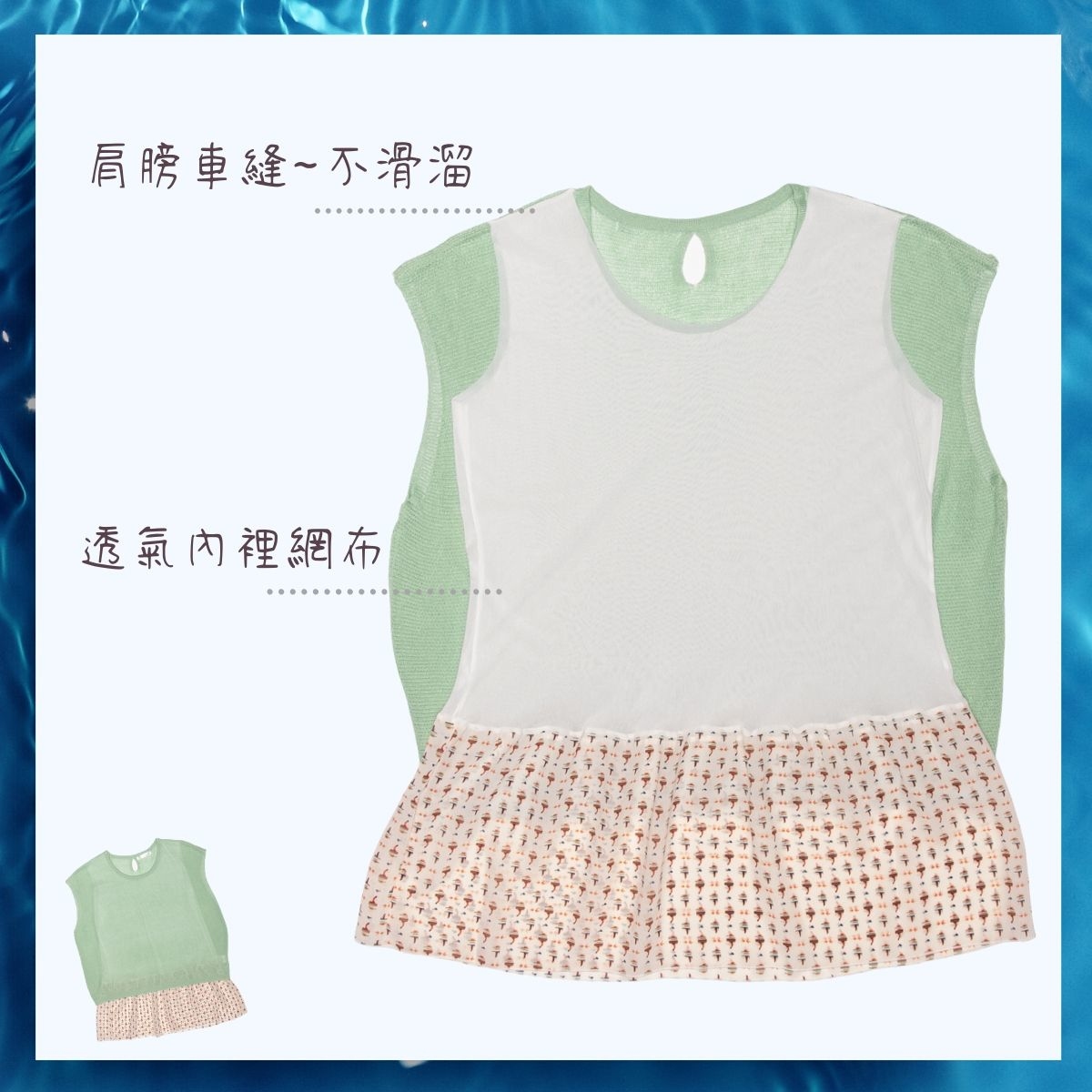 • 假兩件式設計~內裡使用透氣細網布,觸感滑順,下擺拼接淺米色的帆船印花雪紡布,日常穿搭一件就能搞定♪