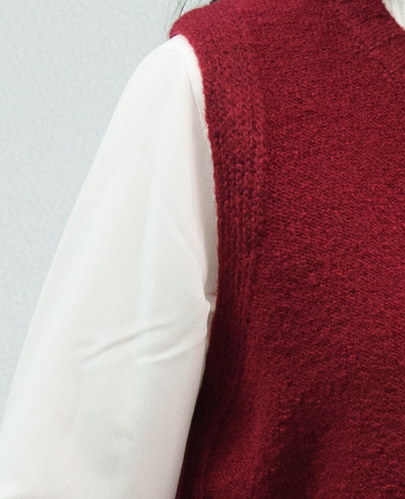 • 選用輕量化的蓬鬆紗線編織,紗線先經過輕刷毛的加工,針織背心輕盈棉柔且稍微有挺度,外觀上很有秋冬的季節感,穿起來卻不厚重,很適合台灣秋冬偏暖的穿搭。