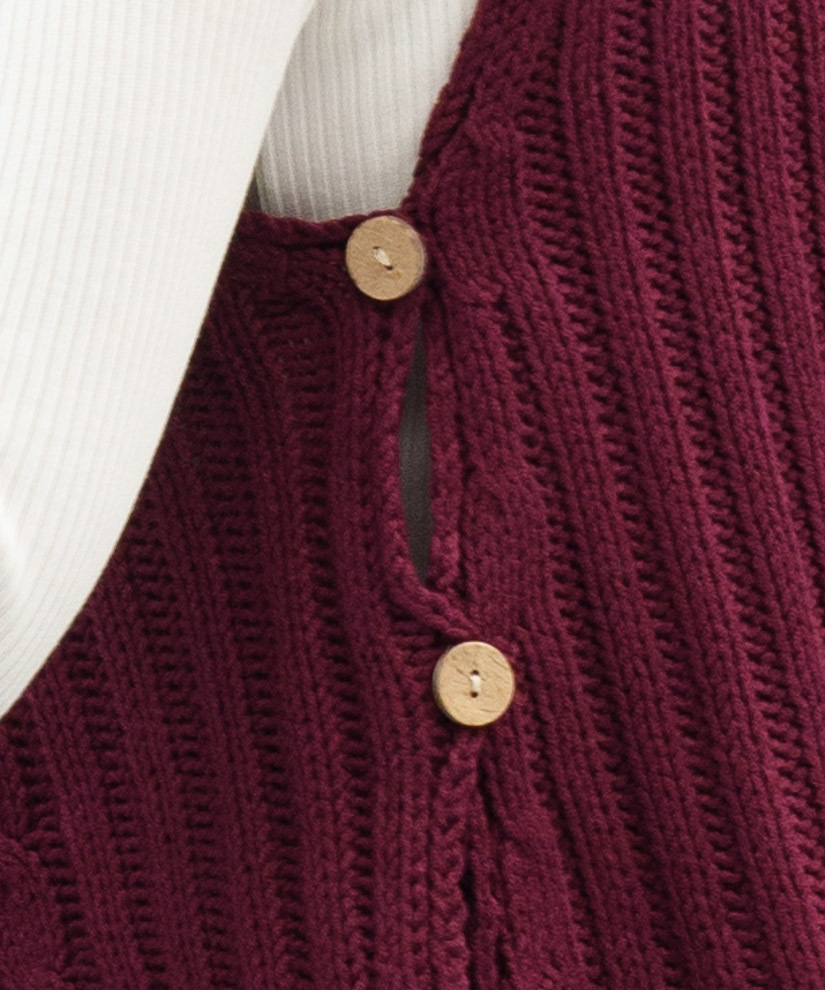 • 開襟背心運用多條紗線合併編織後,觸感更滑順,看似有點厚度穿起來卻不顯厚重,很適合台灣秋冬季節穿搭。