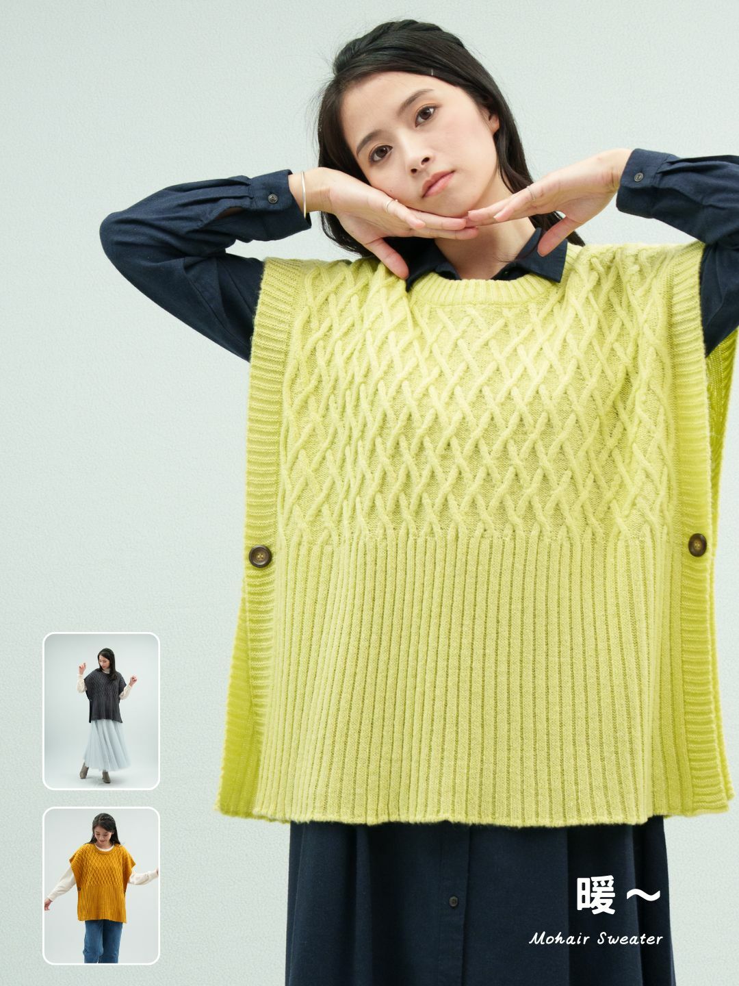 • 選用觸感柔軟的毛海紗線編織,毛衣穿起來輕盈保暖,也不會有刺刺的感覺。