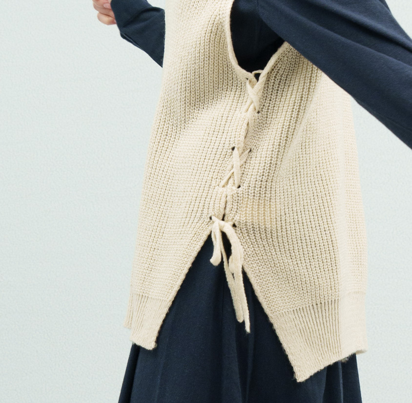 • 兩側綁帶設計: 背心兩側加入同質料的邊帶穿繩設計,為簡約的背心點綴出活潑感,可隨喜好調整鬆緊。