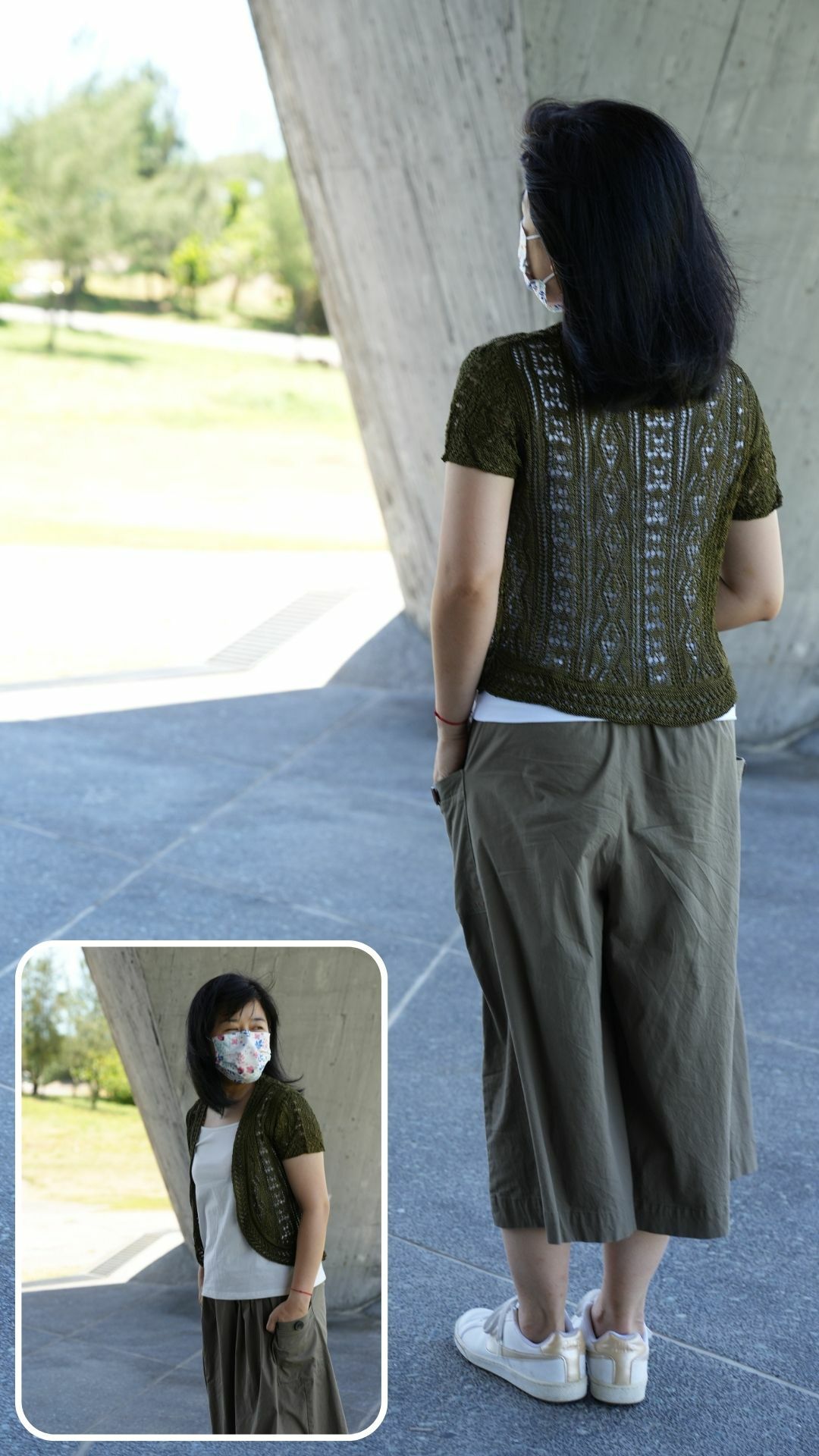 • 衣身運用經典菱格紋編織設計,搭配直紋排列挑洞技法,即使是短版罩衫依然有拉長身形的效果。