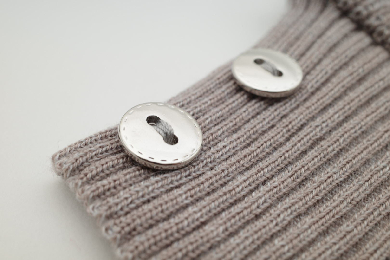 • 再縫上兩顆亮面金屬釦,隱約的光澤感點綴出穿搭質感。