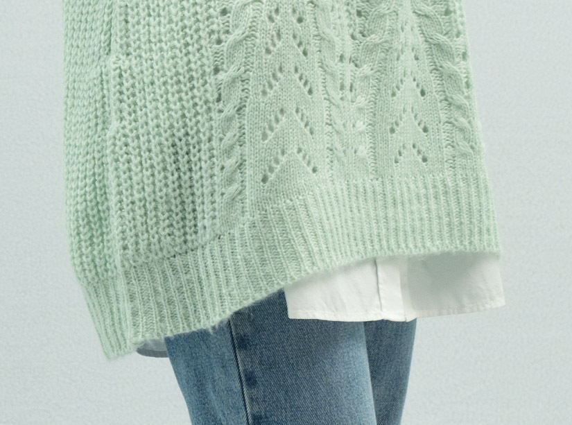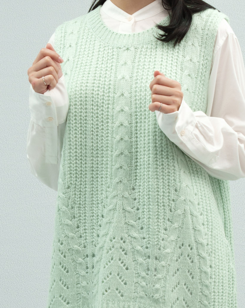 • 麻花背心搭配立體吊目紋設計,順著傘狀版型,融入幾何小挑洞點綴,拉長整體視覺比例,穿搭更顯瘦。