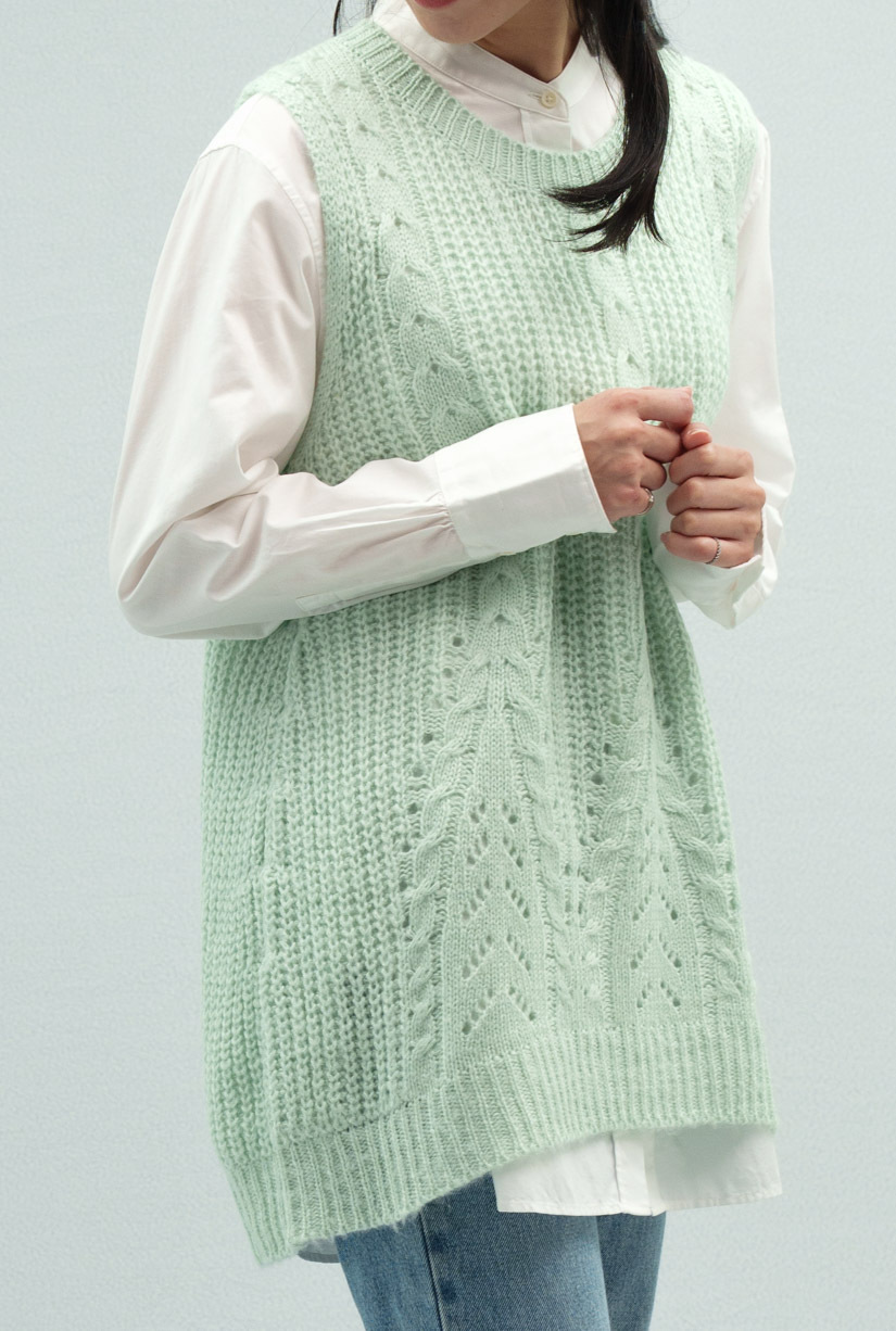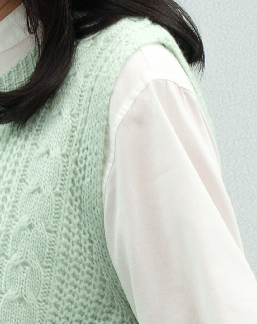 • 選用觸感輕柔的毛海紗線編織,柔和的淡綠色調~針織背心穿搭亮麗~氣色更好。