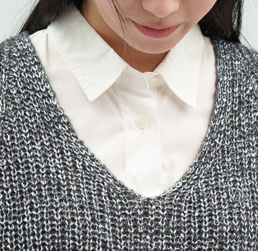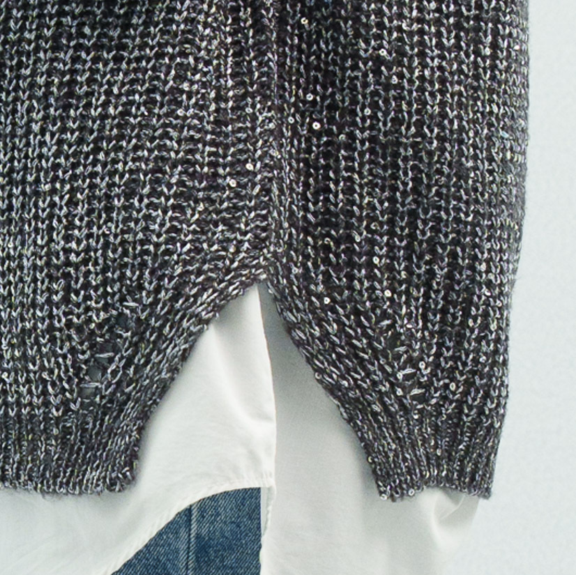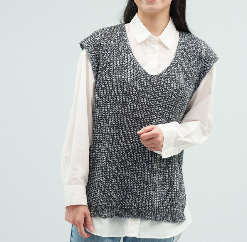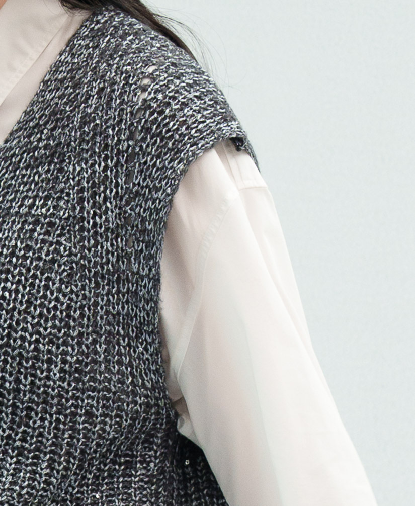 • 針織背心選用銀灰色亮片紗與觸感輕柔的毛海紗混合編織,散發低調的光澤感~展現質感穿搭。