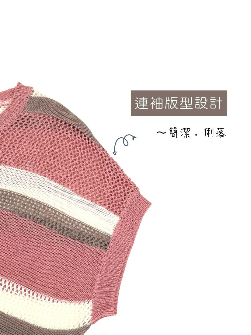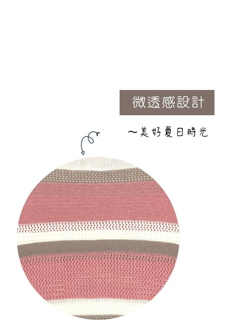 • 中針距單層編織與網狀洞洞織紋相間,搭配活潑的細條紋設計,內搭細肩帶背心就能出門,盡情享受夏日美好時光。
